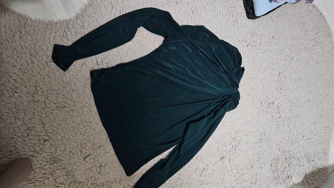 Drapeli tasarıma sahip, balıkçı yaka ve uzun kollu, siyah renkli, sentetik dokulu, vücuda oturan midi boy kadın bluz. Günlük kullanıma uygun modern stil.