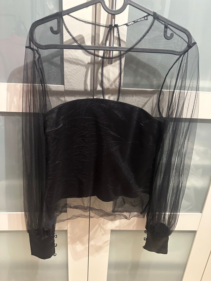 Drapeli, siyah, ince ve şeffaf uzun kollu bluz