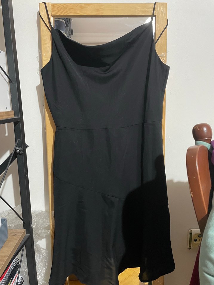 Siyah, önü drapeli, diz üstü, askılı elbise. Minimalist ve şık, romantik akşamlar için uygun. Aldığımda denemek için giymiştim, ama yaza kadar kilo aldığım için sonra giyemedim . 160 boyunda birinin tam diz üstünde kalıyor.