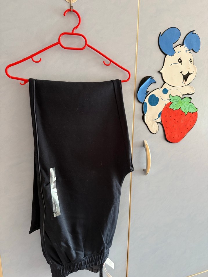 Sentetik kumaştan, drapeli tasarıma ve lastikli manşetlere sahip siyah bol kesim midi pantolon, günlük kullanım için uygundur.