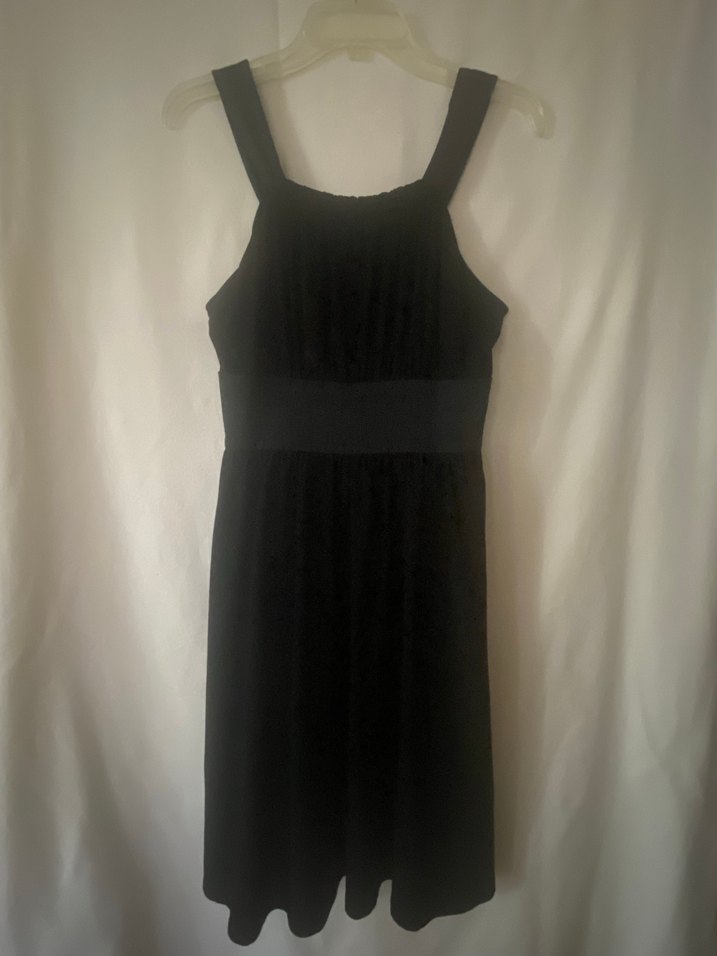 Siyah, kolsuz, yüksek yakalı ve drapeli detaylara sahip, korsajı oturan kesim elbise. Likralı kumaş olduğu için Medium ve Large beden için uygundur. Korsaj : 38 cm.dir. Elbisenin beli ve geri kalan kısmı da Likralı olduğu için her ölçüye uygundur..