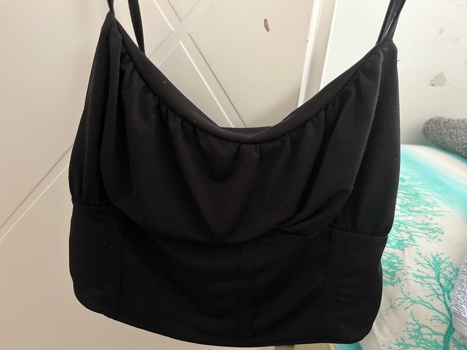 Siyah, drapeli detaylı, kayık yaka ve ince askılı, vücuda oturan midi uzunluğunda gotik tarzda kadın büstiyer. Günlük kullanıma uygundur.