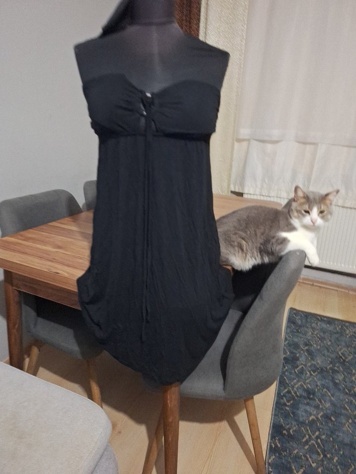Siyah, drapeli ve desen içermeyen koyu tonlarda gotik tarzda kedi kıyafeti.