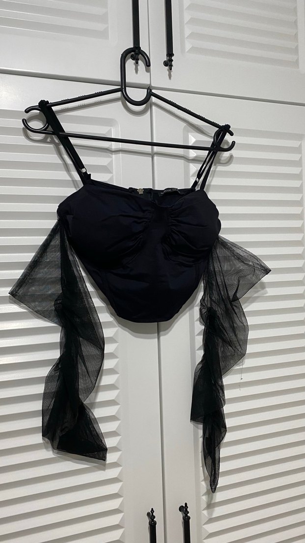 Siyah, dar kesim, askılı ve straplez yaka, drapeli sentetik kumaştan gotik mini büstiyer. Partiler için uygun, trend belirleyici tarzda.
