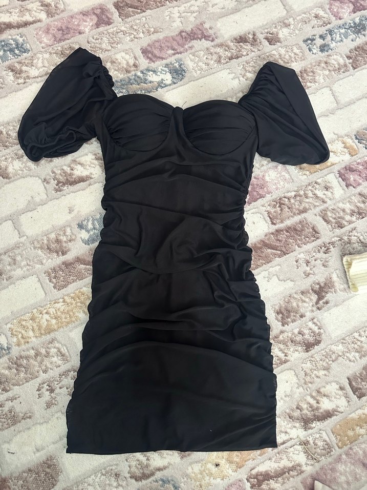 Siyah, drapeli ve V yaka detaylı, askılı kollara sahip, gotik tarzda uzun ve vücuda oturan abiye elbisedir.