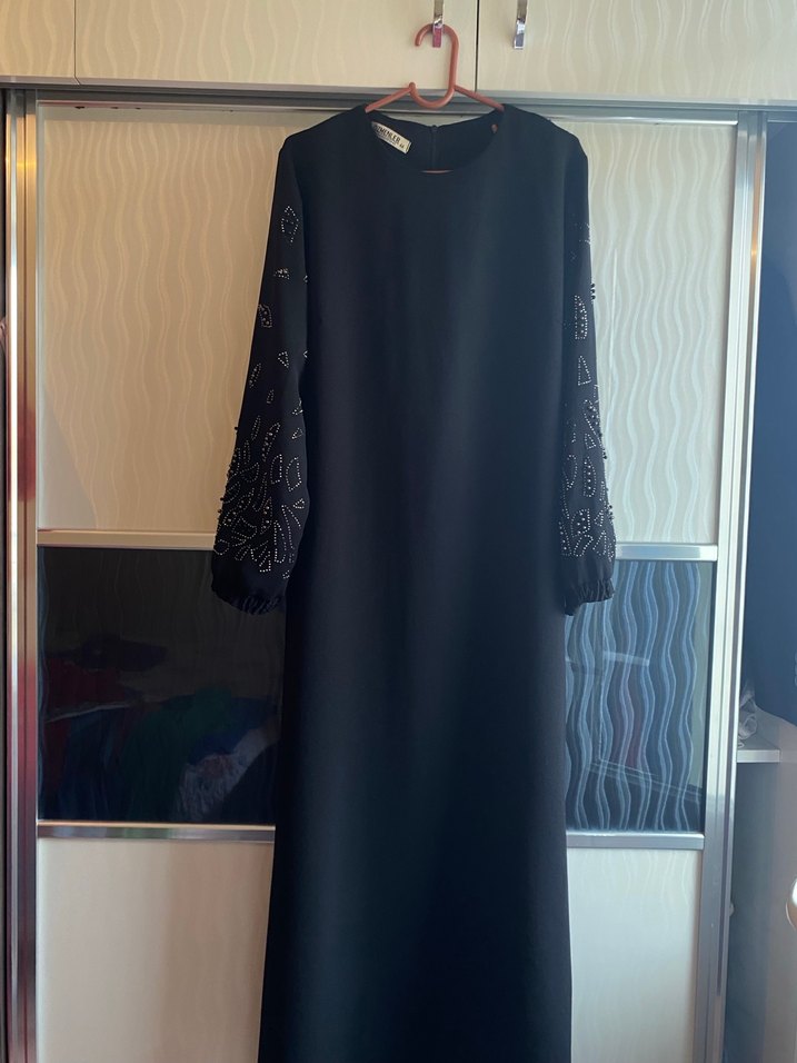 Siyah uzun elbise, bol kesim, drapeli uzun kollu ve yuvarlak yaka detaylarına sahip. Yumuşak sentetik kumaştan, gotik tarzda ve günlük kullanıma uygun. Kusuru yok çok şık