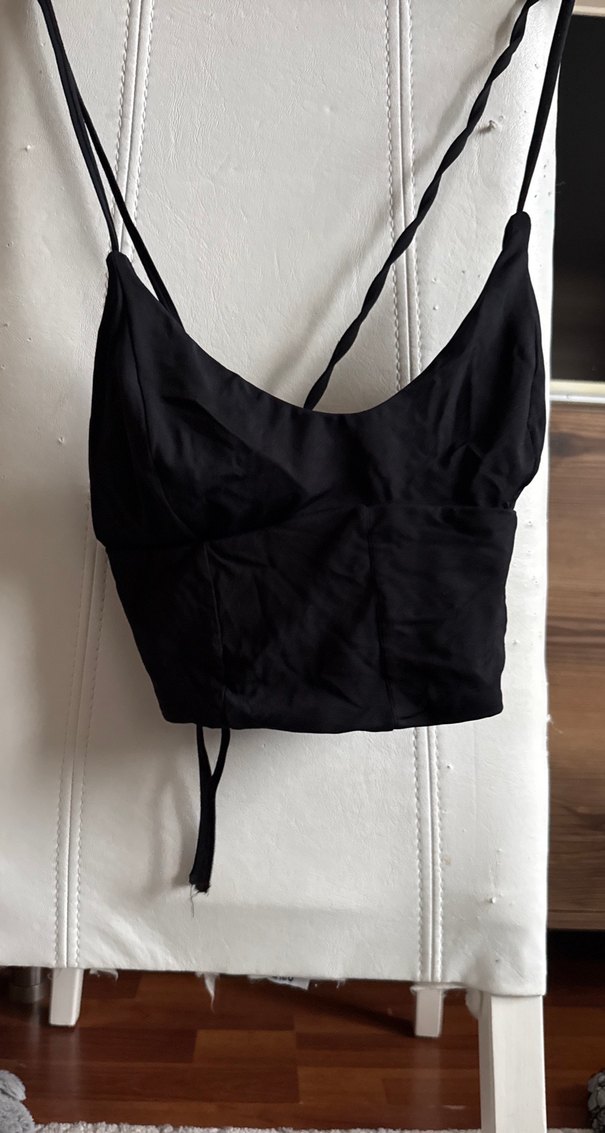 Satenimsi siyah kumaştan yapılmış, drapeli ve halter yakalı, fitted kesim bustiyer. Askıları ince ve midi uzunlukta, cesur goth athleisure tarzına uygun.