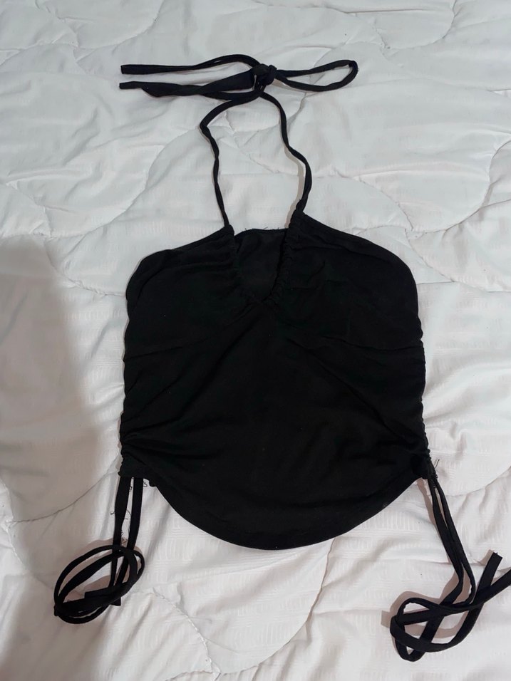 Siyah, halter yaka ve ince askılı, drapeli tasarıma sahip midi boy bustiyer. Sentetik kumaştan üretilmiş, minimalist gotik tarzda.