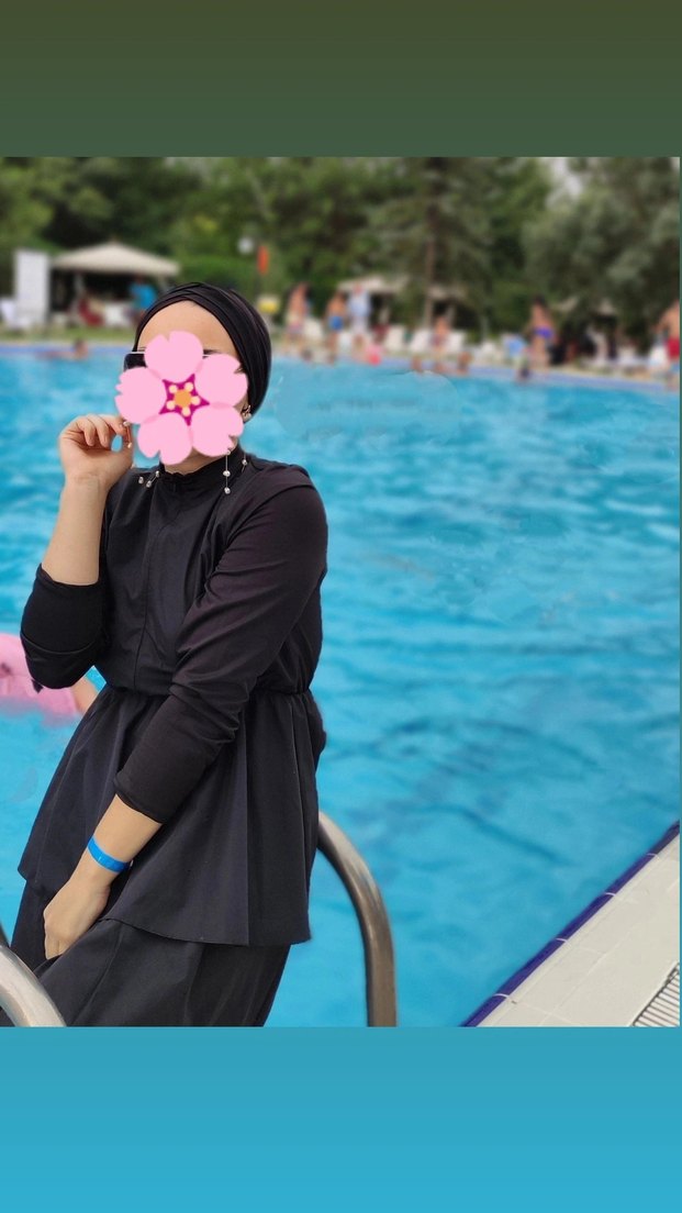 Siyah hasema, yüksek yakalı ve uzun kollu, vücuda oturan kesime sahip. Sentetik kumaştan, drapeli ve hafif batik desenli, mütevazı birkez giyildi sorunu yoktur kaliteli kumaş