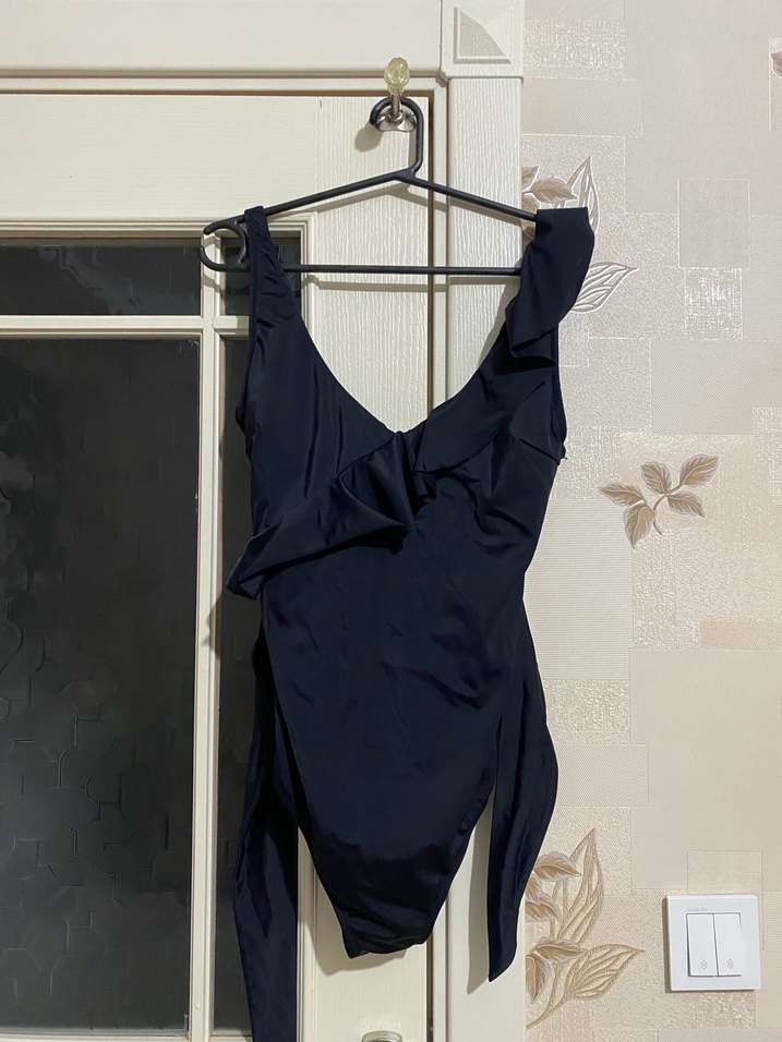 İnce askılı, drapeli tasarıma sahip siyah kadın mayo, günlük kullanıma uygun minimal ve şık bir görünüme sahiptir.