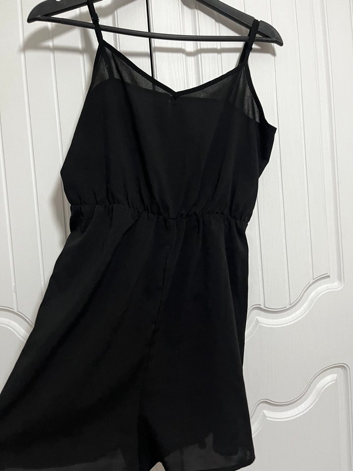 Siyah, ince askılı ve straplez yakalı, drapeli detaylara sahip, ince ve vücuda oturan kadın tulumu.