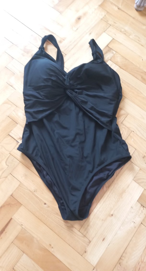 Drapeli detaylara ve ince askılara sahip siyah, vücuda oturan mayo, cesur ve minimalist goth tarzı için uygun.