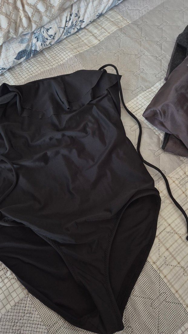 Siyah renkte, ince askılı ve drapeli tasarıma sahip, vücuda oturan modern kesim mayo.
