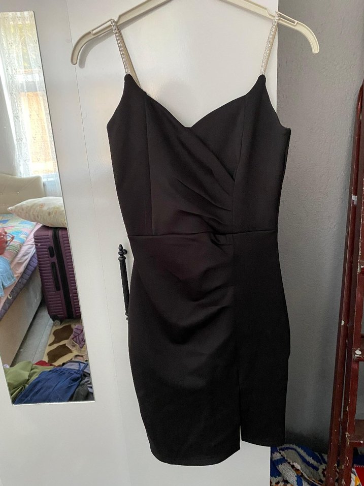 Siyah, ince askılı ve V yakalı bu dar kesim mini elbise, drapeli tasarımıyla cesur ve minimal stil için uygundur. 34 ve 36 beden