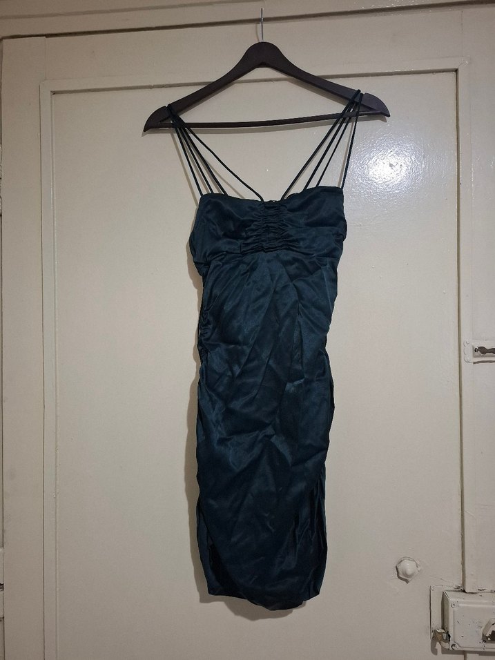 Siyah renkte, ince askılı halter yaka, drapeli ve vücuda oturan uzun abiye elbisedir. Gotik ve avangard tarzıyla parti için uygundur. ✨88 cm boyunda