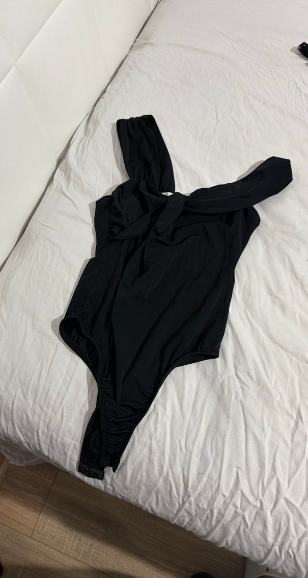 Siyah, drapeli ve ip askılı, midi boyda, vücuda oturan kadın mayosu, avangard sokak stili için uygun.