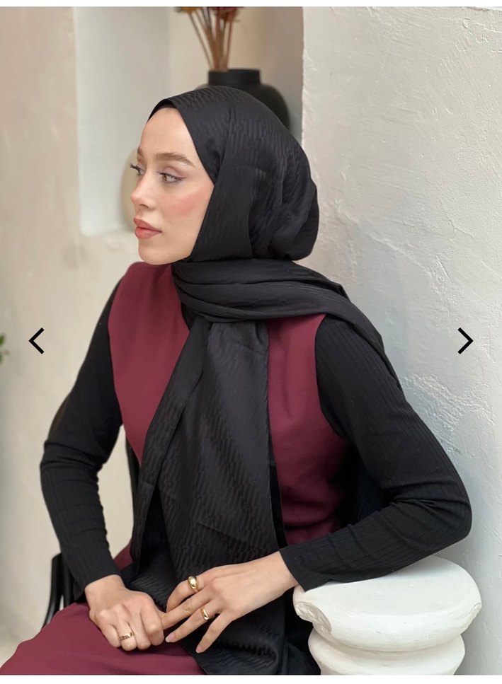 Siyah renkli, yumuşak sentetik kumaştan drapeli tasarıma sahip, mütevazı ve çağdaş minimalist tarzda kadın şalı.