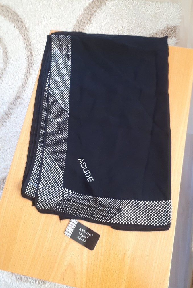 Siyah renkte, drapeli tasarıma sahip kadın atkısı. Kenarında desenli şerit ve 'ASUDE' nakışı bulunur. Sentetik kumaştan, sokak ve athleisure stiline uygun.
