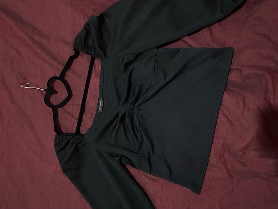 Siyah, yaka, uzun kollu, drapeli, sentetik kumaştan yapılmış, günlük kullanıma uygun, dar kesim goth athleisure tarzı kadın bluz.