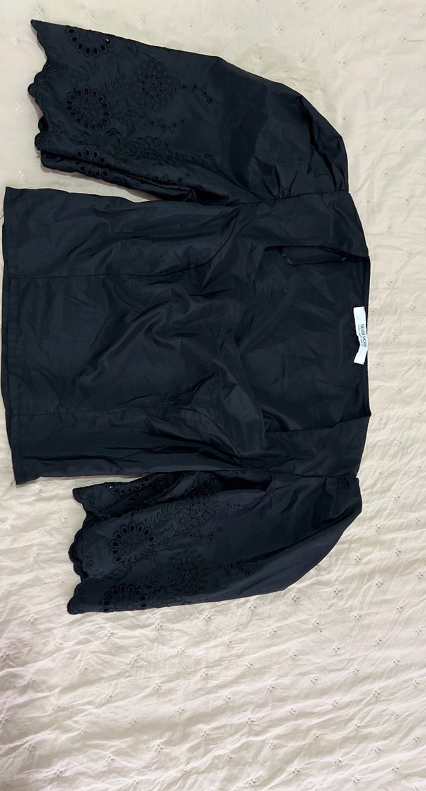Bu siyah kadın bluz, bol kesim ve drapeli detaylara sahip. Uzun kollu ve tek renk, kısa boyda, dış mekan kullanımı için uygun.