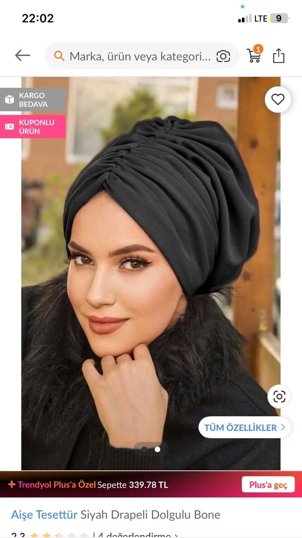 Yumuşak sentetik kumaştan siyah drapeli kadın bone, mütevazı ve gotik tarzda. Rahat bir görünüm sağlar.