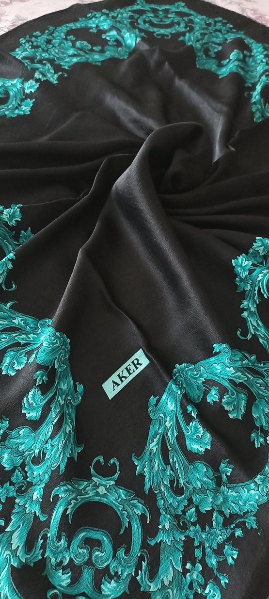 Siyah renkte, ipek dokulu ve drapeli detaylara sahip kadın şalı. Canlı turkuaz desenleri ve AKER etiketiyle klasik ve bohem tarzı sunar.