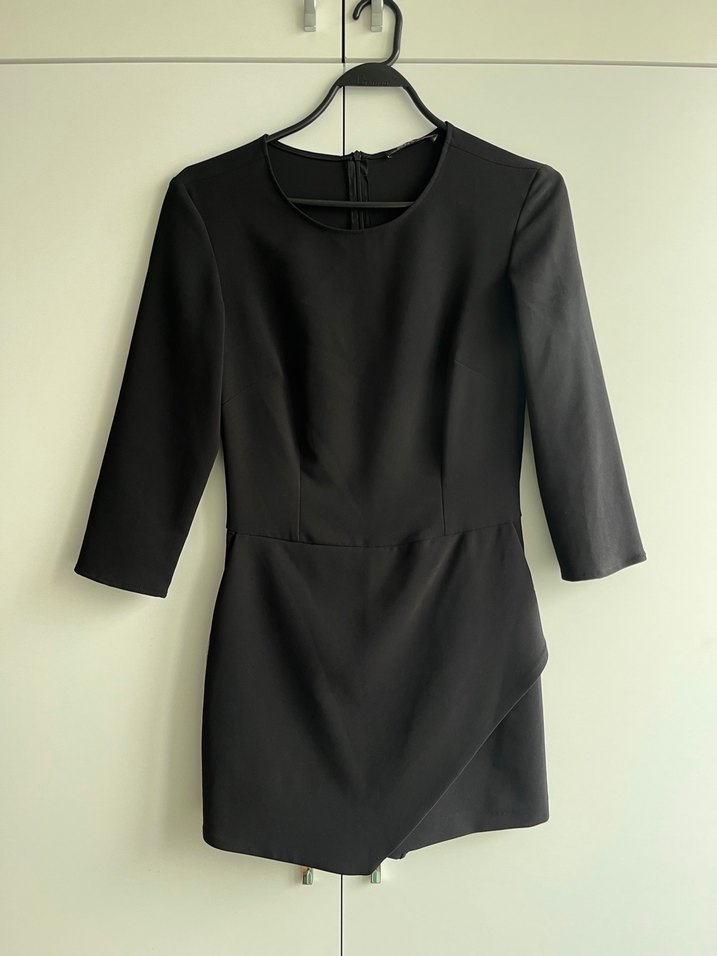 Siyah, uzun kollu ve yuvarlak yakalı, drapeli detaylı, ince kesim midi tulum. İpeksi kumaştan, minimalist ve çağdaş tarzda, ofis için uygun.