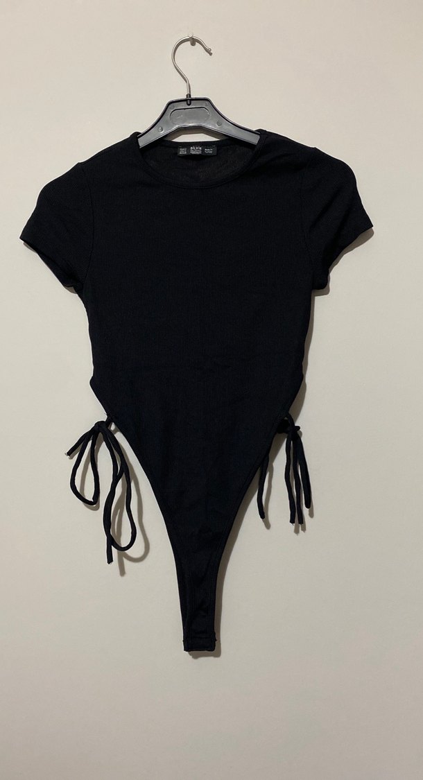 Siyah, dar kesim kadın monokini, askılı kollu ve yanlardan drapeli tasarıma sahip. Midi boyda, cesur gotik tarzda günlük kullanım için uygun.