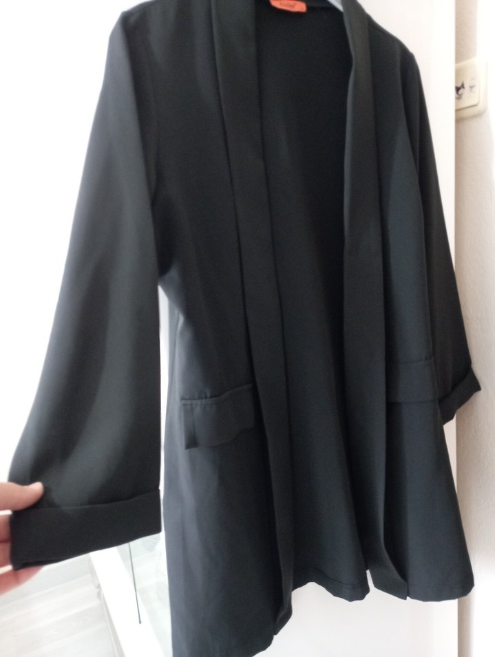 Siyah, uzun kollu, yaka detaylı kadın ofis ceketi. İpeksi kumaştan, normal kesim ve midi boyda.