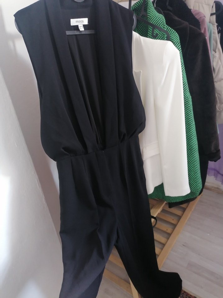 Siyah, kolsuz, yakası kesimli ve drapeli tasarıma sahip bu tulum, yumuşak sentetik kumaştan üretilmiş, düzenli kesim ve uzun boydadır. Ofis için uygundur.