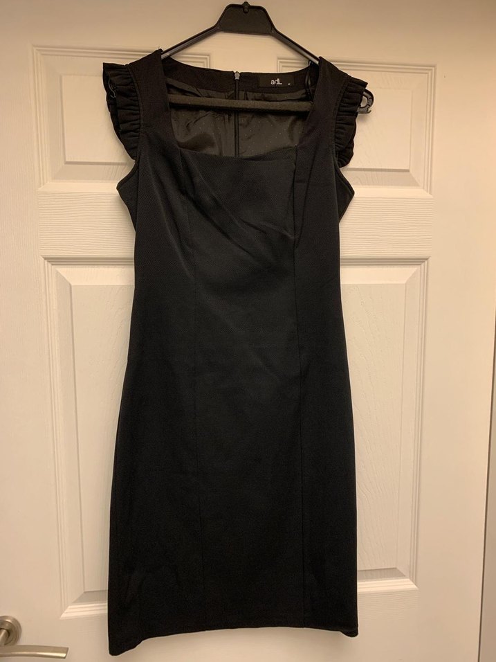Siyah, drapeli detaylara sahip, kare yakalı ve kolsuz bu dar kesim midi elbise, klasik gotik tarzını ofis ortamına uyarlıyor.