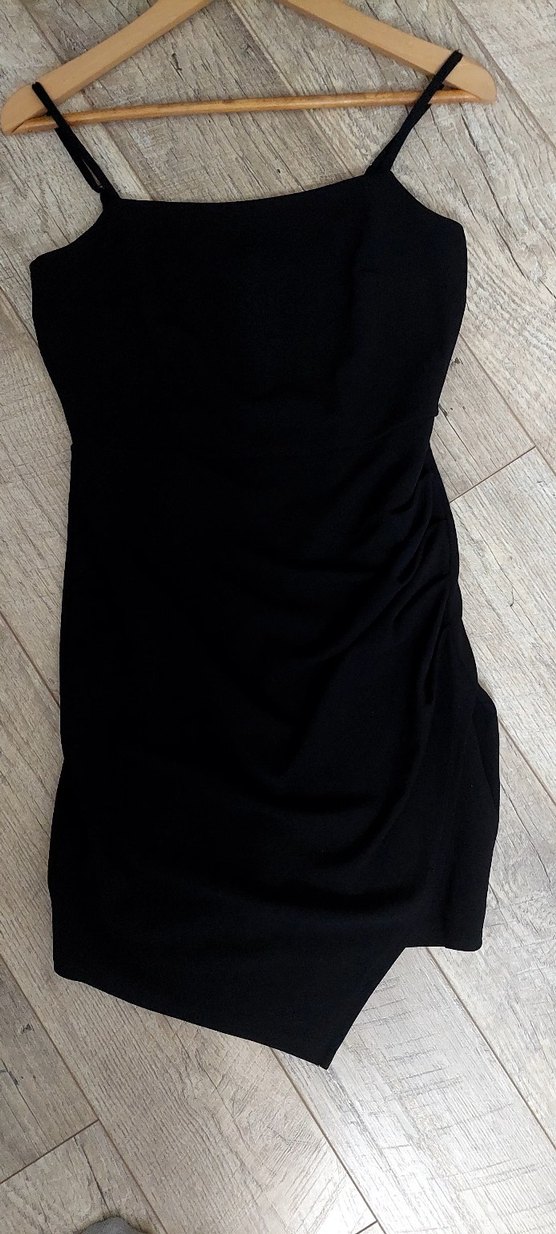 Drapeli ve straplez tasarıma sahip, vücuda oturan siyah elbise. Sentetik kumaştan, midi boyda, minimalist goth tarzında, günlük kullanıma uygun.boy 90cm en 74 cm