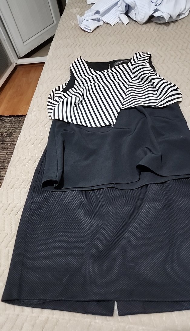 Siyah renkte, sentetik kumaştan yapılmış, drapeli ve kisa kesime sahip dar kesim etek takim