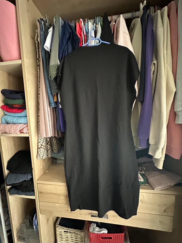 Siyah renkte, kısa kollu ve bisiklet yakalı Sentetik kumaştan olup drapeli detayıyla minimalist sokak modası tarzındadır. Günlük kullanıma uygundur.