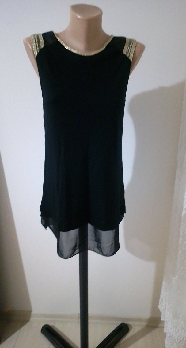 Kolsuz, siyah renkte, drapeli tasarıma sahip bol kesim midi uzunlukta bluz. Gotik tarz ve parti için uygun.