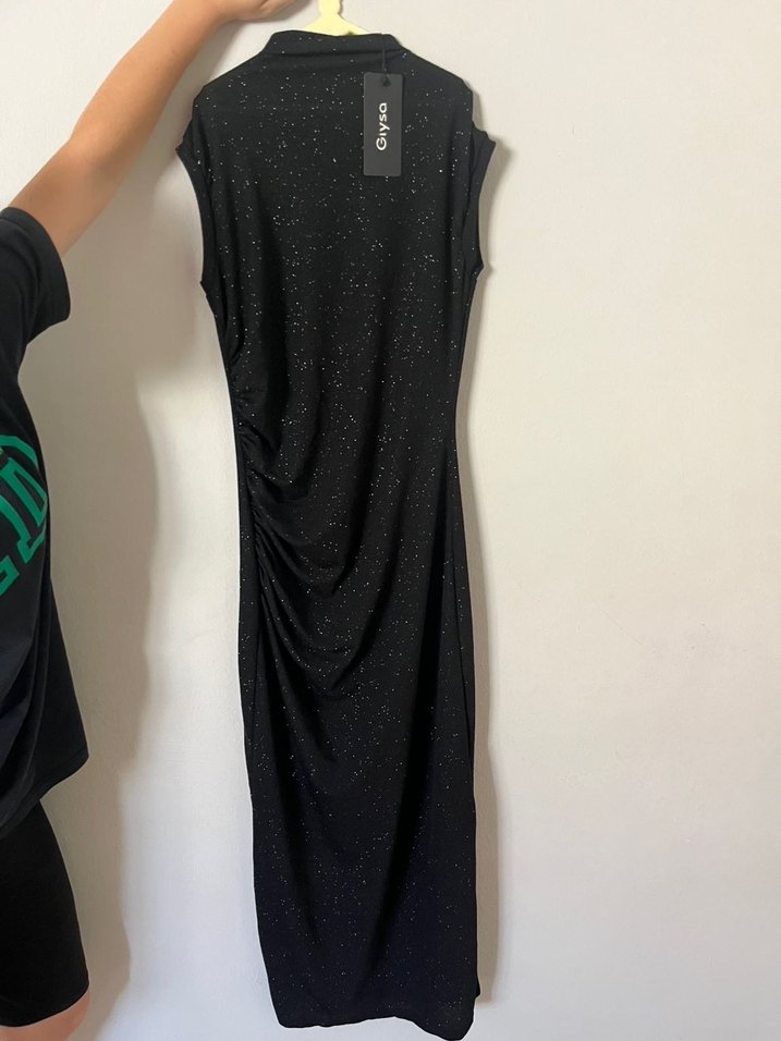 Yüksek yakalı, kolsuz ve drapeli detaylara sahip, siyah uzun ve vücuda oturan elbise. Yumuşak sentetik kumaştan yapılmıştır. hiç giyinmedim etiketi uzerinde on kısmında kısa bir yırtmacı var hiç giyinmediğim için aldığım fiyata satıyorum.
