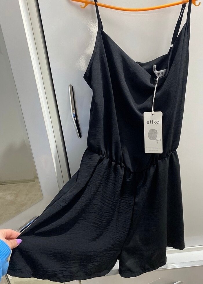 Siyah, kolsuz mini tulum, drapeli yakası ve bol kesimiyle rahat bir görünüm sunar. Yumuşak sentetik kumaştan üretilmiştir, günlük ve sokak stili için uygundur. Marka: etiko.