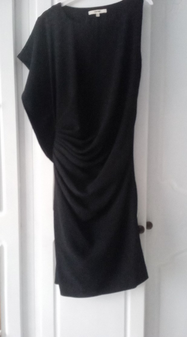 Kolsuz, v yaka ve drapeli detaylı siyah, uzun ve dar kesim elbise, minimalist ve çağdaş tarzda, ofis kullanımına uygun.