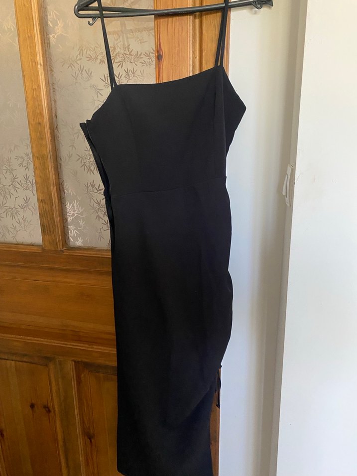Drapeli ve ince askılı, straplez siyah midi abiye elbise, romantik akşamlar için uygun.