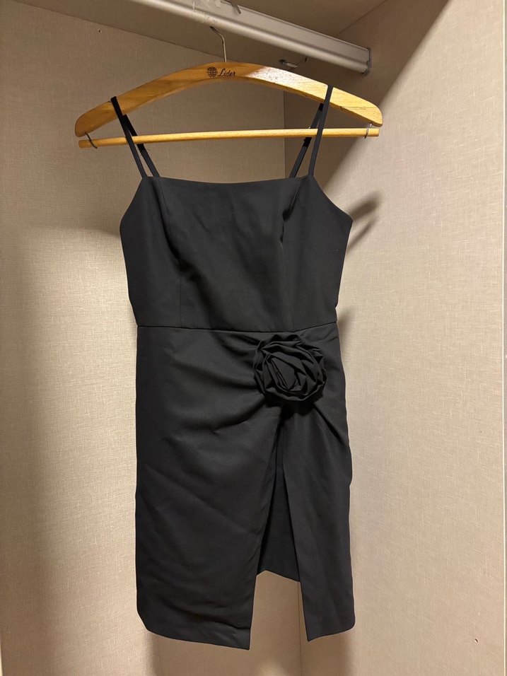 İnce askılı, straplez yakalı siyah elbise, belde drapeli ve çiçek detayına sahiptir.Özel gün kullanım için uygundur.