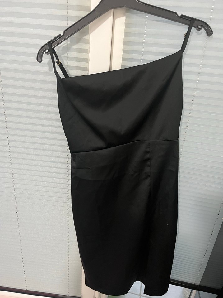 Siyah, askılı, drapeli ve midi boyda, vücuda oturan kadın elbisesi. Minimalist ve şık sokak stili için uygundur.