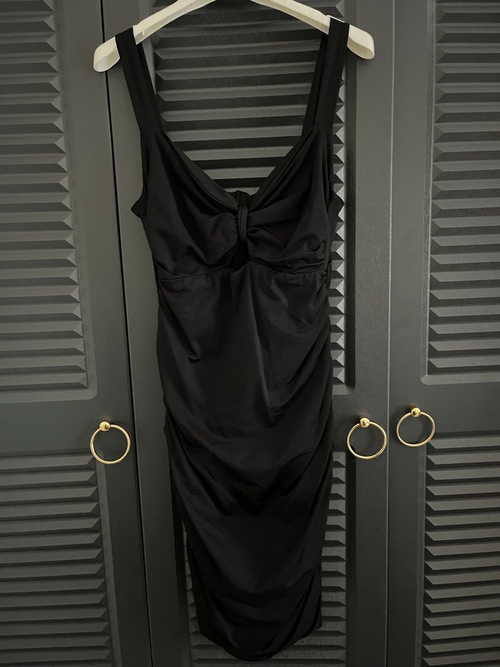 Siyah, drapeli V yakalı, kalın askılı, uzun ve vücuda oturan bir elbise. M bedendir. 1 kez giyildi. Göğüs bağlama detaylı ve üçgen boşluk var. Sırt fermuarlı
