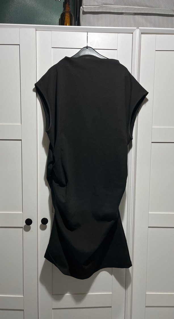 Yüksek yakalı, kolsuz siyah elbise. Rahat kesimli ve drapeli tasarımla, sentetik yumuşak kumaştan midi boyda. Günlük kullanım için uygun, gotik avant-garde tarzda.