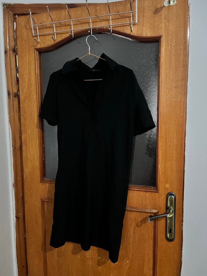 Siyah renkte, yakalı, kısa kollu, bol kesim ve drapeli ipeksi kumaştan elbise, günlük kullanım için uygundur.