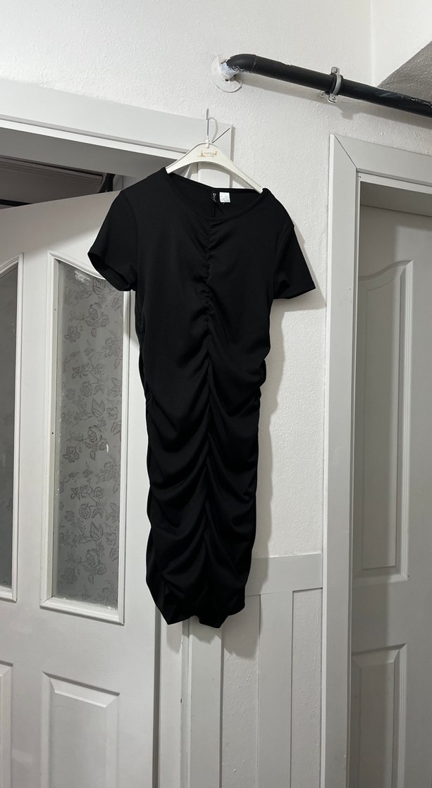 Siyah, drapeli ve kısa kollu hamile elbisesi, midi boyda ve dar kesimlidir. Minimalist gotik tarzda, günlük kullanıma uygundur.