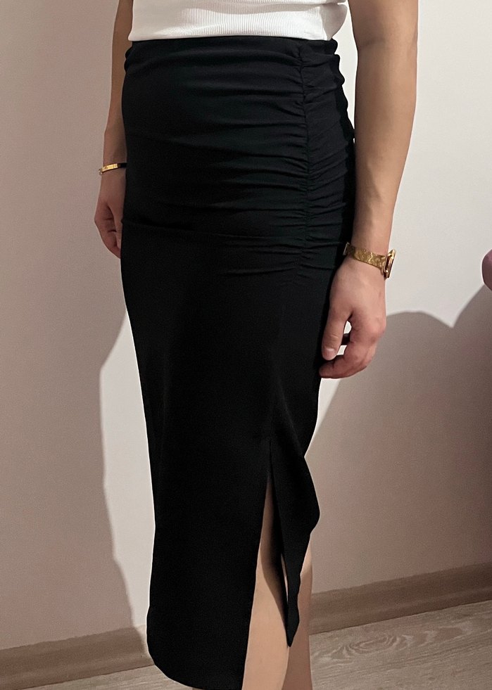 Siyah, drapeli, yan yırtmaçlı, ofis için uygun, midi boyda, dar kesim etek defosu var fotodaki gözüken kısım