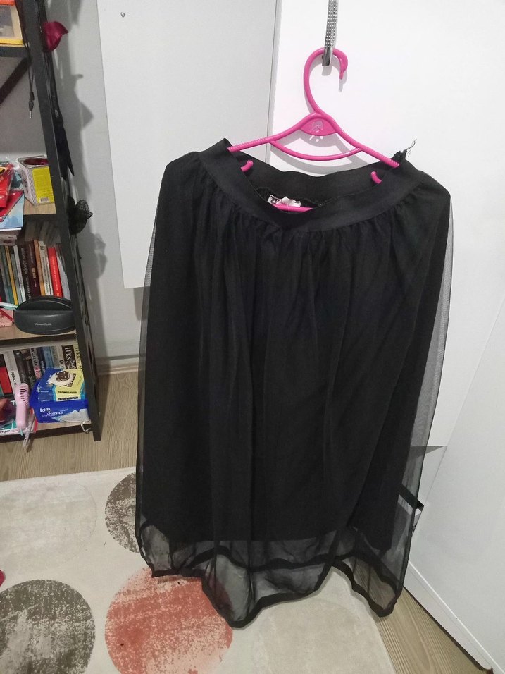 Siyah midi uzunlukta, drapeli ve bol kesim gotik etek. Sentetik kumaştan üretilmiş, desen içermeyen bu etek parti için uygundur.