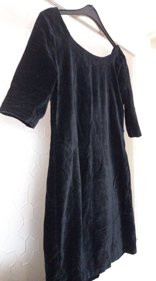Drapeli, kısa kollu, kayık yaka siyah midi elbise, kadife ofiste gotik ve şık bir görünüm sağlar. boy 82 cm