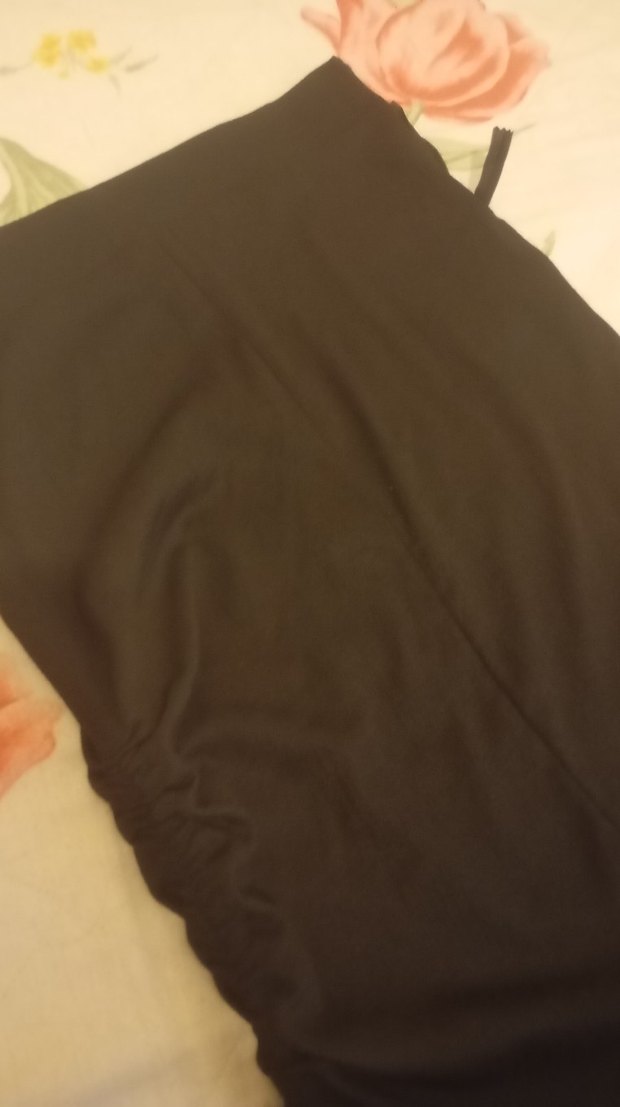 Drapeli ve satenimsi dokulu, siyah midi uzunluğunda, fitted hamile eteği. Minimalist ve gotik tarzda, günlük kullanıma uygun.