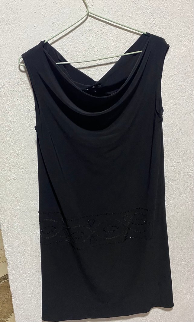 Siyah, drapeli, kayık yaka, kolsuz ve vücuda oturan midi boy abiye elbise, gotik ve şık tarz için uygundur.